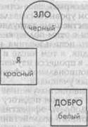 Фигура "Добро" расположена в средней верхней части листа и обозначена маленьким черным квадратом. Форма данного символа показывает, что девочка связывает с понятием "Добро" разумное начало. На вопрос о том, почему именно она выбрала фигуру черного цвета, Маша ответила: "Не знаю. Притягивает, красиво. Никакой другой не подойдет". Эта фигура помещена выше двух других и достаточно близко к символу "Я".