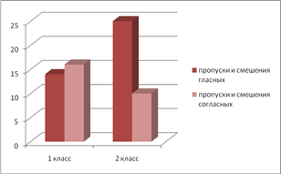 У школьников 1 класса обнаружено наибольшее количество смешений согласных (особенно парных глухих и звонких согласных), во 2 классе их число было значительно меньшим.