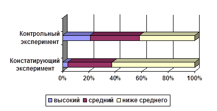 Высокий уровень был зарегистрирован у 20,8 % детей, средний – 37,5 % детей, уровень ниже среднего показал 41,7 % детей. Результаты констатирующего и контрольного экспериментов по определению уровней овладения детьми дошкольного возраста деятельностью экспериментирования представлены на рисунке 3.