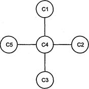 Решение. Поскольку по данному определению узловым называется тот сервер, с которым непосредственно связаны все другие серверы, то в матрице нужно искать строку, состоящую только из единиц. Это строка — С 4. Значит сервер С4 является узловым.