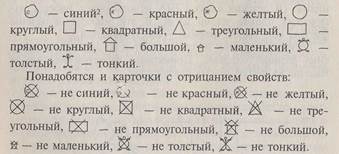 Наряду с логическими блоками в работе применяются карточки (5x5 см), на которых условно обозначены свойства блоков (цвет, форма, размер, толщина).