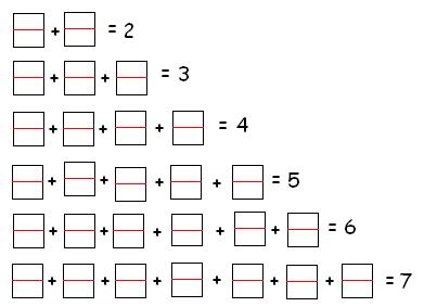 Возьмите комплект домино и отложите в сторону кость 0:0. Теперь, рассматривая оставшиеся косточки как дроби (правильные и неправильные), расположите их как на рисунке, чтобы в каждой строке равнялась числу косточек данной строки.