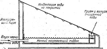 Для повышения эффективности системы необходимо, чтобы при конденсации на поверхности покрытия образовывалась водная пленка, так как при конденсации воды в виде капель значительная часть падающей на поверхность покрытия солнечной радиации отражается ими; даже при сравнительно больших, углах наклона поверхности, когда вода довольно быстро стекает, примерно половина всей поверхности покрытия занята каплями воды. На тщательно очищенной от следов жира стеклянной поверхности обычно образуется пленка воды, тогда как почти на всех, даже более чистых пластмассовых поверхностях сконденсированная вода выпадает в виде капель. На некоторых новых пластических материалах возможна пленочная конденсация воды, но такие материалы вследствие высокой стоимости (приближающейся к стоимости стекла) для рассматриваемых целей непригодны.
