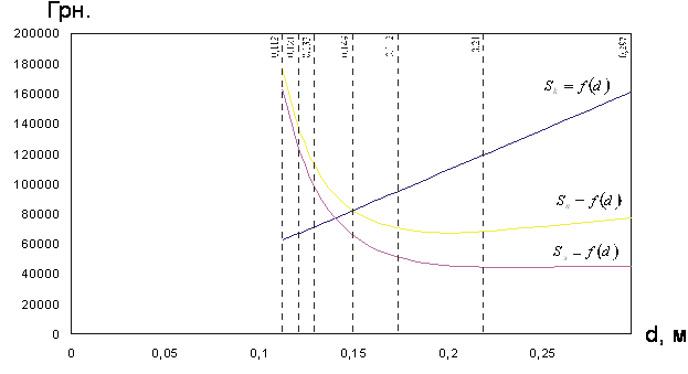 Рис. 3.1. Графическое определение оптимального диаметра трубопровода
