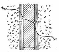 Рис. 1. Характер изменения температур при теплопередаче через плоскую стенку