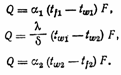 Соотношение для расчета коэффициента теплопередачи можно вывести, рассмотрев процесс передачи тепла от одного теплоносителя к другому через разделяющую их стенку. На рис. 1 показана плоская стенка толщиной d, материал которой имеет коэффициент теплопроводности l. По одну сторону стенки протекает теплоноситель с температурой tf1 в ядре потока, по другую сторону—теплоноситель с температурой tf2. Температуры поверхностей стенки tw1 и tw2. Коэффициенты теплоотдачи a1 и a2. При установившемся процессе количество тепла, передаваемого в единицу времени через площадку F от ядра потока первого теплоносителя к стенке, равно количеству тепла, передаваемого через стенку и от стенки к ядру потока второго теплоносителя.