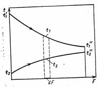На рис. 2 показан характер изменения температур теплоносителей «при прямоточном движении их вдоль поверхности теплообмена. Один из теплоносителей охлаждается от температуры t’1 до t’’1, другой нагревается от t’2 до t’’2. Количество тепла, переданное в единицу времени от первого теплоносителя ко второму на произвольно выделенном элементе теплообменной поверхности можно определить по основному уравнению теплопередачи: