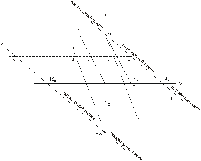 При включении двигателя без добавочного резистора (естественная характеристика - 1) груз поднимается со скоростью двигателя w1. При включении добавочного резистора (искусственная характеристика - 2) груз не подвижен (w2=0). При работе двигателя в режиме, определяемом характеристикой 3, груз опускается со скоростью w1, искусственная характеристика 4 соответствует режиму динамического торможения, заключающемуся в отсоединении якорной цепи от источника и замыкании ее на добавочный резистор, характеристика 5 аналогична характеристике 2, но напряжение U=Uном, характеристика 6 параллельна характеристики 1 и соответствует во втором квадранте противовключению при подаче напряжения U=Uном.