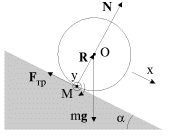 Уравнение движения центра масс (3.1) запишем для проекций ускорения и сил на ось x вдоль наклонной плоскости, а уравнение моментов (3.22) - для проекций углового ускорения и момента силы трения на ось y , совпадающую с осью цилиндра. Направления осей x и у выбраны согласованно, в том смысле, что положительному линейному ускорению оси цилиндра соответствует положительное же угловое ускорение вращения вокруг этой оси. В итоге получим: