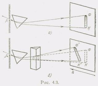 Опыт 1. Прохождение света через скрещенные призмы. Перед отверстием А, пропускающим в затемненную комнату узкий пучок солнечных лучей, помещают призму с горизонтально ориентированным преломляющим ребром (рис. 4.3,а).