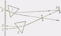 Пучок солнечных лучей, выходя из отверстия А, проходит через призму 1 и затем попадает на зеркало 2. Ориентируем зеркало таким образом, чтобы послать на призму 3 только ту часть лучей, которые преломляются в наибольшей степени. Преломившись в призме 3, эти лучи попадают на экран в районе точки В. Затем передвинем зеркало 2, поместив его теперь так, чтобы оно посылало на призму 3 те лучи, которые преломляются в наименьшей степени (см. штриховое изображение). Испытав преломление в призме 3, эти лучи попадут на экран в районе точки С. Ясно видно, что те лучи, которые преломляются в наибольшей степени в первой призме, будут наиболее сильно преломляться и во второй призме.