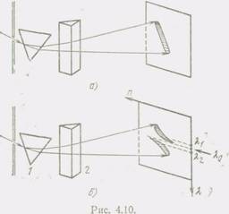 На рис. 4.10, а воспроизведена уже знакомая картина: при прохождении через две скрещенные стеклянные призмы свет дает на экране наклоненную полоску спектра. Теперь предположим, что одна из стеклянных призм заменена полой призматической кюветой, заполненной раствором органического соединения, называемого цианином; именно такую призму использовал Кундт в одном из своих опытов. Схема опыта Кундта