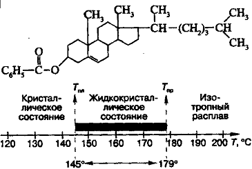 Первое ЖК-соединение — холестерилбензоат и диаграмма, иллюстрирующая температурную область существования ЖК-фазы.