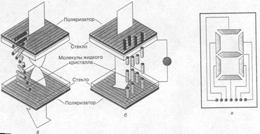 Рис. 6 Схема работы ЖК-индикатора на твист-эффекте: а — до включения электрического поля, б — после включения поля, в — семисегментной буквенно-цифровой электрод, управляемый электрическим полем.