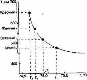 У большинства холестериков с ростом температуры шаг спирали уменьшается, а следовательно, уменьшается и длина волны селективно отраженного света lmax (рис. 7). Иными словами, каждой из указанных на рис. 7 температур — Т0, Т1, Т2 и Т3 — соответствует свой цвет. Таким образом, нанося холестерические жидкие кристаллы на поверхности различных объектов, можно получать топографию распределения температуры, что делает их незаменимыми термоиндикаторами и визуализаторами для различного рода применений в технике и медицине. Вводя холестерики в полимерные пленки, то есть получая так называемые капсулирован-ные жидкие кристаллы, можно создавать весьма удобные в обращении пленочные материалы, которые можно использовать в качестве термометров, а также для визуализации и "фотографирования" тепловых полей.