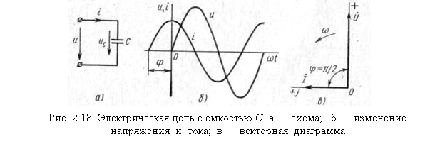 Рассмотрим электрическую цепь, состоящую из источника питания и конденсатора емкостью С (рис. 2.18, а). Будем считать, что конденсатор имеет идеальный диэлектрик, т. е. его активное сопротивление равно нулю. К цепи с конденсатором подведено синусоидальное напряжение