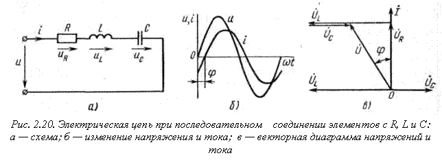 Схеме электрической цепи, изображенной на рис. 2.20, а, может соответствовать цепь последовательно соединенных индуктивной катушки с активным сопротивлением R и индуктивностью L и конденсатора с емкостью С. Активное сопротивление может также соответствовать сопротивлению какого-либо резистора. Во всяком случае, R, L и С — это параметры электрической цепи, причем активное сопротивление R характеризует активный (необратимый) процесс преобразования электрической энергии в другие виды энергии, а индуктивность L и емкость С — обратимый процесс преобразования энергии электромагнитного поля.