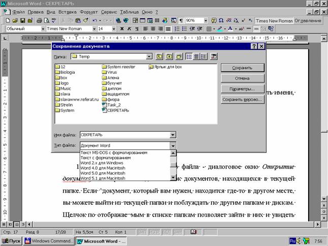 Для создания и редактирования документов во всем мире используется множество различных программ, поэтому вам, вполне вероятно, может понадобиться сохранить свой документ в другом формате, - чтобы тот человек, для кого ваш документ предназначен, смог прочесть ваш документ и работать с ним, используя свою программу обработки текстов. Диалоговое окно Сохранение документа позволяет, помимо всего прочего, сохранять документ в файлах различного формата.