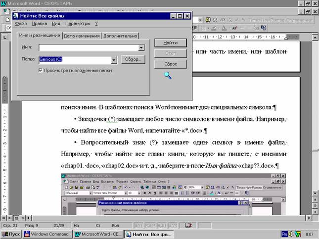 Вы можете также производить поиск без использования специальных символов. Для этого достаточно набрать часть имени - любую последовательность символов, которые содержатся в имени. Например, введя “Име”, вы сможете найти файлы с именами “Именины. dос”, “Пример 1.doc” и “Пример2. dос”.