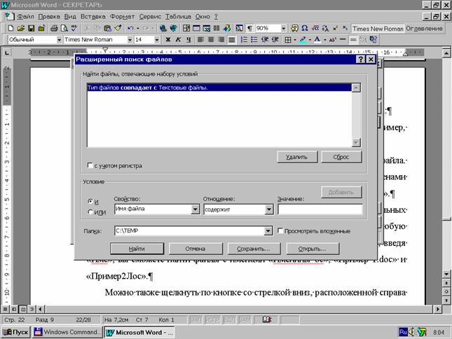 • Вопросительный знак (?) замещает один символ в имени файла. Например, чтобы найти все главы книги, которую вы пишете, с именами “chap01. doc”, “chap02.doc” и т. д., наберите в поле Имя файла “chap??.doc”.