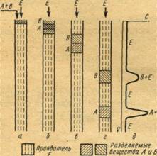 Проявительная хроматография. Заполненную сорбентом колонку промывают чистым газом Е, обычно сорбирующимся слабее всех остальных компонентов смеси. Затем, не прекращая потока газа Е, в колонку вводят порцию анализируемой смеси, например, вещества А и В, которые сорбируются в верхних слоях сорбента (рис. 1, а) и вследствие движения газа постепенно перемещаются вдоль слоя сорбента с различными для каждого компонента скоростями. В результате зона лучше сорбирующегося вещества, например В, постоянно отстает от зоны хуже сорбирующегося вещества А (рис. 1, б, в) и при достаточной длине колонки смесь веществ А и В разделяется (рис. 1,г). Изменение концентрации вымываемых веществ по выходе из колонки может быть зафиксировано в виде непрерывной кривой, называемой хроматограммой (рис. 1, д).