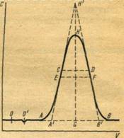Целесообразно рассмотреть хроматограмму для одного компонента более подробно (рис. 2). Обычно по оси абсцисс откладывается объем проходящего через колонку газа, называемого газом-носителем. В случае постоянства скорости газа-носителя по оси абсцисс можно откладывать пропорциональное объему газа время опыта, а по оси ординат—изменение концентрации хроматографического компонента по выходе его из колонки. Точка О соответствует моменту ввода пробы анализируемого вещества, точка О'— появлению на выходе из колонки несорбирующегося газа. Таким образом, отрезок 00' соответствует объему колонки, заполненному несорбирующимся газом (V0). Линия ОВ, проходящая параллельно оси абсцисс, называется нулевой линией. Кривая АНВ называется хроматографическим пиком данного компонента, а расстояние от нулевой линии до максимума пика H, т. е. GH,—высота пика (h).