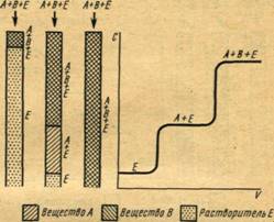 Фронтальный метод состоит в непрерывном пропускании анализируемой смеси через слой сорбента в колонке. Если анализируемая смесь состоит из двух компонентов А и В, изотерма сорбции которых линейная, и наиболее слабо сорбирующегося газа Е, то последний заполняет весь объем колонки и покидает ее в чистом виде. При этом на хроматограмме фиксируется горизонтальная линия (нулевая линия) (рис. 3). Если компонент А сорбируется слабее чем компонент В, то после насыщения сорбента веществом А из колонки начинает выходить смесь этого вещества с газом Е. На хроматограмме появляется ступень, высота которой соответствует концентрации А в Е на выходе из колонки. Эта концентрация может быть равна или больше исходной концентрации А. Наконец, когда сорбент насыщается также и веществом В, из колонки начинает выходить смесь газа, содержащая все исходные компоненты, а на хроматограмме появляется вторая ступень, высота которой соответствует суммарной исходной концентрации веществ А и В.