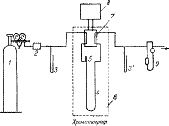 1 – баллон высокого давления с газом-носителем; 2 – стабилизатор потока; 3 и 3 ' – манометры; 4 – хроматографическая колонка; 5 – устройство для ввода пробы; 6 – термостат; 7 – детектор; 8 – самописец; 9 – расходомер