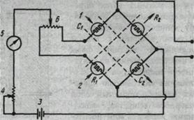соответственно температура спирали. Это приводит к изменению сопротивления нити, которое измеряют с помощью моста Уитстона (рис. 7). Сравнительный поток газа-носителя омывает нити ячеек R1 и R2 а газ, поступающий из/колонки, омывает нити измерительных ячеек С1 и С2. Если у четырех нитей одинаковая температура (одинаковое сопротивление), мост находится в равновесии. При изменении состава газа, выходящего из колонки, сопротивление нитей ячеек С1 и С2 меняется, равновесие нарушается и генерируется выходной сигнал.