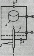 Детектор электронного захвата представляет собой ячейку с двумя электродами (ионизационная камера), в которую поступает газ-носитель, прошедший через хроматографическую колонку (рис. 8). В камере он облучается постоянным потоком b-электронов, поскольку один из электродов изготовлен из материала, являющегося источником излучения (63Ni, 3Н,