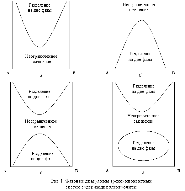 1. Две жидкости при данной температуре смешиваются неограниченно. Добавление электролита вызывает высаливание и расслаивание системы (рис. 1а).