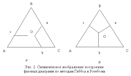 В методе Гиббса за единицу принимается высота треугольника и состав смеси выражают линиями, перпендикулярными сторонам треугольника, соединяющими точки внутри его со сторонами, лежащими против углов, отвечающих 100% данного компонента (рис. 2б).