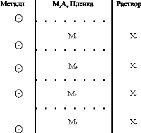 Рис. 5. Двойной слой Гельмгольца на границе металла в равновесии с ионами металла в жидкой фазе (М+) и анионами (Х-).