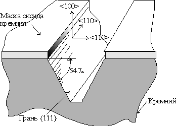 Щелочные реагенты являются в основном анизотропными травителями с преимущественным воздействием на кристаллографические плоскости с малыми индексами. Плотность свободных связей (дефектов, обусловленных свободными незавершенными связями граничной кристаллической плоскости) для этих плоскостей находится в соотношении 1.00 : 0.71 : 0.58. Причина выбора (100) - ориентированного среза кремния для анизотропного травления заключается в том, что это единственная из основных плоскостей, в которой плоскости (110), (111), (100) и (211) пересекаются с регулярной симметрией. Поэтому эта ориентация наиболее предпочтительна при травлении глубоких канавок в кремнии. Следует отметить, что геометрия поверхности, создаваемой изотропным травлением, будет зависеть от геометрии первоначальной поверхности, так как выпуклые поверхности ограничивают быстро травящиеся плоскости, а медленно травящиеся плоскости останавливаются на вогнутой поверхности. В направлении<100> скорость травления в 100 раз выше, чем в направлении <111>. На рис. 13 показан пример преимущественного травления 54о- ой канавки в пересечении 110/100/111 смесью KOH изопропанола при 85оС. KOH и изопропанол являются травителями с соотношением скоростей травления 55:1 для направлений <100> и <111>.