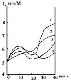 Для пластификации эпоксидиановой смолы используется жидкий полисульфидный каучук (тиокол НВТ-1), дибутилфталат (ДБФ), полиэфирную смолу МГФ-9 и каменноугольный деготь Д-3. Изнашивание осуществлялось по закрепленному абразиву. В результате экспериментов установлено (рис. 7), что введение пластификаторов увеличивает абразивный износ эпоксидного полимера. Вместе с тем графические зависимости износа эпоксидных полимеров от содержания пластификаторов имеют ряд экстремумов. Так, например при увеличении концентрации пластификатора до 10 мас.ч. наблюдается повышение износа связующего. Дальнейшее увеличение содержания пластификатора приводит к появлению минимума в области 20 мас.ч. на кривых износа эпоксидных полимеров, модифицированных ДБФ, смолой МГФ-9 и каменноугольным дегтем Д-3. Необходимо отметить, что пластифицированные эпоксидные композиты с минимальным износом обладают более низкой износостойкостью по сравнению с не модифицированным эпоксидным олигомером. Некоторый сдвиг минимума на кривой износа эпоксидного полимера, модифицированного тиоколом НВТ-1 обусловлен, по-видимому, частичным взаимодействием эпоксидных групп смолы с меркантановыми группами тиокола. Введение пластификаторов свыше 20 мас.ч. приводит к существенному снижению износостойкости, что связано с ухудшением физико-механических свойств связующего.
