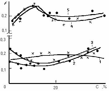 Рис. 8 Зависимость коэффициента трения композиции на эпоксидно-полисульфидном связующем от количества в них меди (P=10 МПа) при оптимальном объемном содержании, %: MoS - 21,6 (1); MoSe - 21,7 (2); графита – 17 (3); ПТФЭ – 25 (4) и нефтяного кокса- 10 (5) [5].