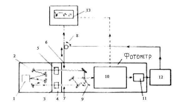 1 – источник излучения; 2 – зеркала; 3 – кювета с образцом; 4 – зона образца; 5 – кювета сравнения; 6 – аттенюаторная гребёнка; 7 – гребёнка; 8 – сервомотор; 9 – прерыватель; 10 – монохроматор; 11 – детектор (термолинза); 12 – усилитель; 13 – самописец.