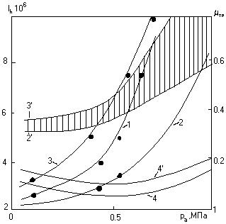 Рис. 4 Зависимость интенсивности линейного изнашивания Ih (1 – 4) и коэффициента трения mтр (2’ – 4’) эпоксидно – диановых полимеров от номинального давления при трении без смазки (1 –3; 2’, 3’) и со смазкой маслом марки И – 50 (4 и 4’):