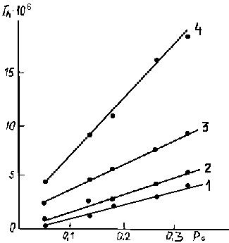 Рис. 5 Зависимость интенсивности линейного изнашивания Ih от номинального давления Pa при трении без смазки текстолита ПТК (1, 2, 3) и пресс-материала «антифрик» (4) [6].