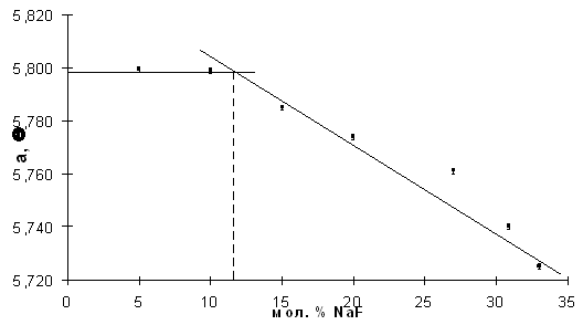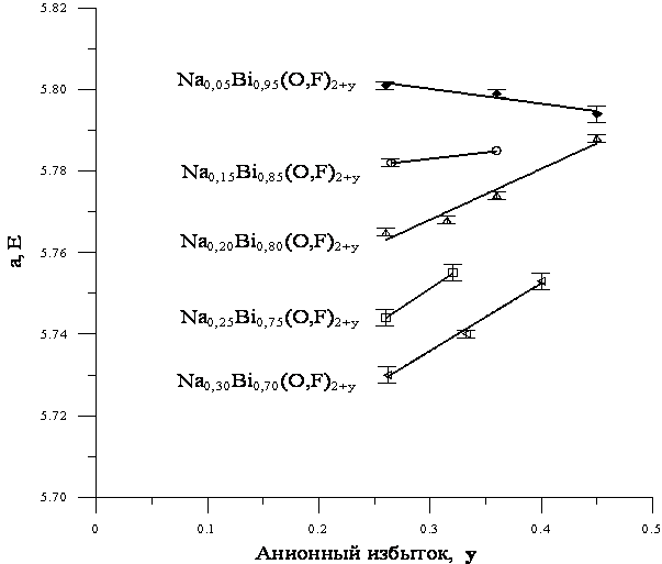 Рис. 11. Зависимости параметра кубической элементарной ячейки фазы Ф от анионного избытка на изоконцентратах натрия.