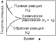 Следовательно, в состоянии равновесия две реакции - прямая (синтез аммиака) и обратная (разложение аммиака) протекают одновременно и с одинаковыми скоростями, а концентрации исходных веществ и продуктов реакции не изменяются во времени. Схематически изменение скорости прямой и обратной реакций во времени, а также достижение состояния химического равновесия можно представить в следующем виде (рис.1):
