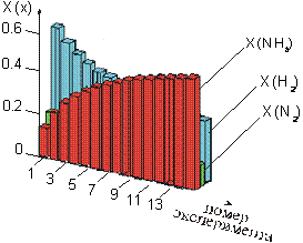 Затем обращаем внимание учащихся на то, как влияет изменение давления на систему, находящуюся в состоянии равновесия. Нажатием клавиши на клавиатуре компьютера учитель подает команду на повышение давления в системе - учащиеся наблюдают на экране монитора динамику построения гистограммы (рис.2)[1] в процессе установления равновесия при каждом последующем повышении давления и графика влияния давления на содержание реагирующих веществ и продуктов реакции после достижения состояния равновесия (рис.3). Анализируя рисунки 2 и 3, учащиеся приходят к выводу, что с увеличением давления молярная доля аммиака (X(NH3)) увеличивается, а водорода (Х(H2)) и азота (Х(N2)) - уменьшается, т.е. равновесие смещается в сторону синтеза аммиака.