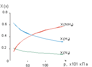 Рис. 4. Модельная демонстрация влияния давления на смещение равновесия в системе N2 + 3H2 2NH3.