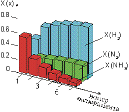 Рис. 5. Гистограмма влияния температуры на молярную долю азота, водорода и аммиака. |