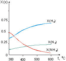 Рис. 7. Модельная демонстрация влияния температуры на смещение равновесия в системе N2 + 3H2 2NH3 + Q.