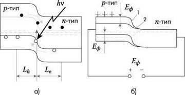 Простейшая конструкция солнечного элемента (СЭ) – прибора для преобразования энергии солнечного излучения – на основе монокристаллического кремния показана на рис. 2. На малой глубине от поверхности кремниевой пластины p-типа сформирован p-n-переход с тонким металлическим контактом. На тыльную сторону пластины нанесен сплошной металлический контакт. Когда СЭ освещается, поглощенные фотоны генерируют неравновесные электрон-дырочные пары. Электроны, генерируемые в p-слое вблизи p-n-перехода, подходят к p-n-переходу и существующим в нем электрическим полем выносятся в n-область. Аналогично и избыточные дырки, созданные в n-слое, частично переносятся в p-слой (рис. 3а). В результате n-слой приобретает дополнительный отрицательный заряд, а p-слой – положительный. Снижается первоначальная контактная разность потенциалов между p- и n-слоями полупроводника, и во внешней цепи появляется напряжение (рис. 3б). Отрицательному полюсу источника тока соответствует n-слой, а p-слой – положительному.