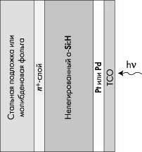 Производство структур на основе монокристаллического кремния, удовлетворяющих данным требованиям, – процесс технологически сложный и дорогостоящий. Поэтому внимание было обращено на такие материалы, как сплавы на основе аморфного кремния (a-Si:H), арсенид галлия и поликристаллические полупроводники. Аморфный кремний выступил в качестве более дешевой альтернативы монокристаллическому. Первые СЭ на его основе были созданы в 1975 году. Оптическое поглощение аморфного кремния в 20 раз выше, чем кристаллического. Поэтому для существенного поглощения видимого света достаточно пленки а-Si:Н толщиной 0,5–1,0 мкм вместо дорогостоящих кремниевых 300-мкм подложек. Кроме того, благодаря существующим технологиям получения тонких пленок аморфного кремния большой площади не требуется операции резки, шлифовки и полировки, необходимых для СЭ на основе монокристаллического кремния. По сравнению с поликристаллическими кремниевыми элементами изделия на основе a-Si:Н производят при более низких температурах (300°С): можно использовать дешевые стеклянные подложки, что сократит расход кремния в 20 раз. Пока максимальный КПД экспериментальных элементов на основе а-Si:Н – 12% – несколько ниже КПД кристаллических кремниевых СЭ (~15%). Однако не исключено, что с развитием технологии КПД элементов на основе а-Si:Н достигнет теоретического потолка – 16 %. Наиболее простые конструкции СЭ из а-Si:Н были созданы на основе структуры металл – полупроводник (диод Шотки) (рис. 6). Несмотря на видимую простоту, их реализация достаточно проблематична – металлический электрод должен быть прозрачным и равномерным по толщине, а все состояния на границе металл/а-Si:Н – стабильными во времени. чаще всего солнечные элементы на основе а-Si:Н формируют на ленте из нержавеющей стали или на стеклянных подложках, покрытых проводящим слоем.