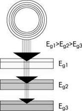 Проблема с применением рассмотренных p-i-n-элементов в том, что их можно оптимизировать только в одном измерении. Значительно больше возможностей в этом плане предоставляет СЭ с поперечным переходом [4]: на изолирующей подложке перпендикулярно к поверхности формируется p-i-n-структура a-Si:H (рис. 9). Такой СЭ не требует прозрачного проводящего оксида в качестве контакта и широкозонного p-слоя для создания прозрачного оконного слоя, его можно изготовить посредством стандартных технологий микроэлектроники. Один из наиболее перспективных материалов для создания высокоэффективных солнечных батарей — арсенид галлия. Это объясняется таким его особенностями, как: