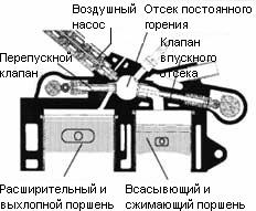 В "камеру сгорания", хотя в ней уже ничего не сгорает, под давлением подаётся и холодный сжатый воздух из баллонов, он сразу же нагревается, расширяется, давление резко возрастает, поршень большого цилиндра возвращается и передаёт рабочее усилие на коленчатый вал.