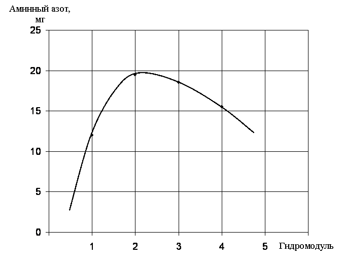 Постановка эксперимента заключалась в следующем: в семь колб объёмом в 100см3 вносили по 10 г гомогената шквары, затем одновременно раствор ферментного препарата и соответствующий объём воды. После внесения фермента и воды колбы закрывали и ставили на 3 часа в ультратермостат при 50оС. Результаты эксперимента оценивали по степени накопления аминного азота (рис.6). Как видно на рисунке 6 для активного гидролиза белков сырья достаточен гидромодуль гомогенат / вода = 1/1 : 1,5. Дальнейший рост содержания воды в среде увеличения степени гидролиза не даёт.